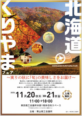 11月20日(木)・21日(金)の2日間、東京商工会議所本部ビル1階多目的スペースにて「北海道くりやまフェア」を開催いたします。
