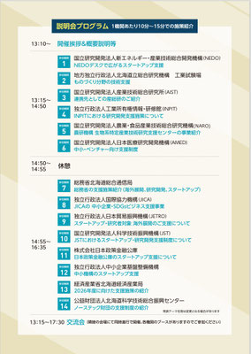 本説明会では、令和8年度の概算要求等に基づき、北海道地域の中小企業や研究機関が活用可能な研究開発支援制度を